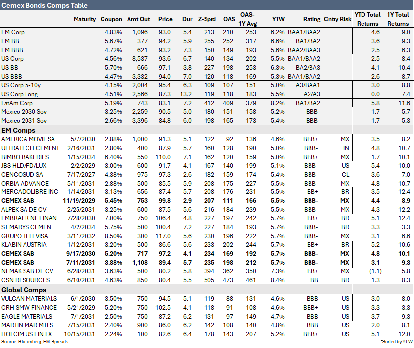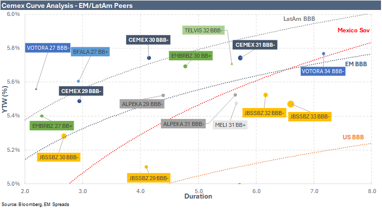 We find CX (BBB-/BBB-) 5.20% 2030 bonds yielding 5.7% for the 4.0-year duration attractive at current spread levels. These notes are trading wider than the Mexican Sovereign, EM BBB, and US BBB curves. In comparison, the broader EM BBB Index yields 5.6%, the broader US BBB Index yields 5.3%, and the Mexican Sovereign bonds maturing in 2030 yield 5.2%. Current yields also compared favorably to BBB- rated peers, such as JBSBZ (Baa3/BBB-/BBB-) 3.00% 2029 notes yielding 5.1% for the 4.1-year duration, UTCMIN (Baa3/BBB-) 2.80% 2031 bonds yielding 5.0% for the 5.7-year duration, and VOTRA (Baa3/BBB) 5.75% 2034 notes yielding 5.7% for the 7.2-year durations. We prefer CX 5.20% 2030 notes trading wider than the Mexico Sovereign, EM BBB index, LatAm BBB index, and peers.