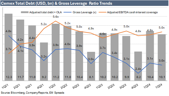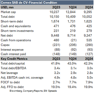 Funds from operations (adjusted EBITDA minus cash interest paid and cash tax paid) were $535.1 million in 2Q24, modestly down from $559.7 million in 2Q23 (1Q24: $405.6 million). Adjusted EBITDA covered comfortably $157.3 million of cash interest paid, including $30.0 million of interest on Cemex’s subordinated debt and $127.3 million of cash tax paid. The company’s interest expense was $92.7 million in 2Q24, up from $88.1 million in 2Q23 (1Q24: $92.4 million), while cash interest paid was $157.3 million, lower than $178.4 million in 2Q23 (1Q24: $179.4 million).