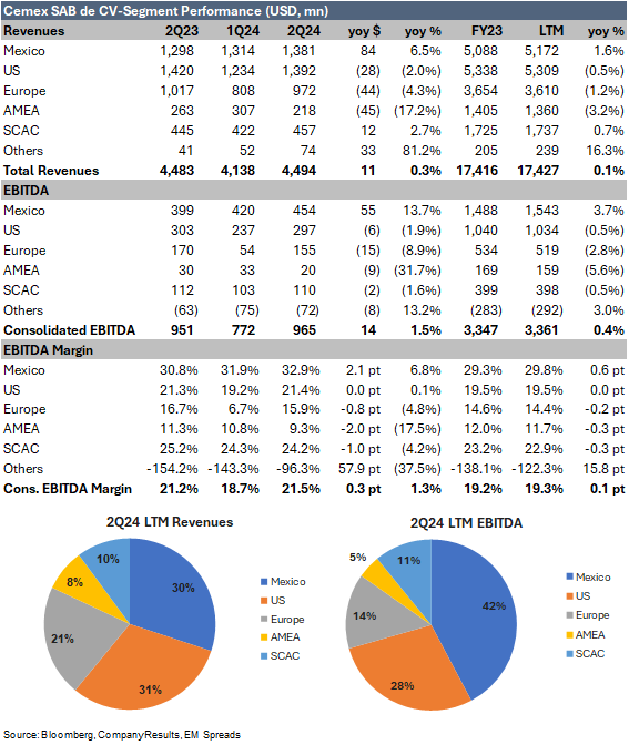Mexico 2Q24 revenue increased by 6.5% yoy to $1.4 billion. Improved prices and solid volumes primarily drove the growth. EBITDA from Mexico saw a significant improvement, rising by 13.7% to $454 million from $399 million in 2Q23. EBITDA margin expanded 2.1 percentage points to 32.9% from 30.8% in the previous year. The margin expansion was supported by price increases and a deceleration in costs, particularly energy.