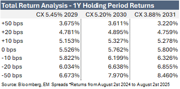 For EM investors, we prefer CX 5.20% 2030, considering these bonds are trading wide to the Mexican Sovereign, the EM BBB Index, and the LatAm Index. Over the next year, the notes offer an additional 10-30 bps compression potential and a more favorable risk-return profile than the current spread levels on CX 5.45% 2029 notes and CX 3.88% 2031 notes