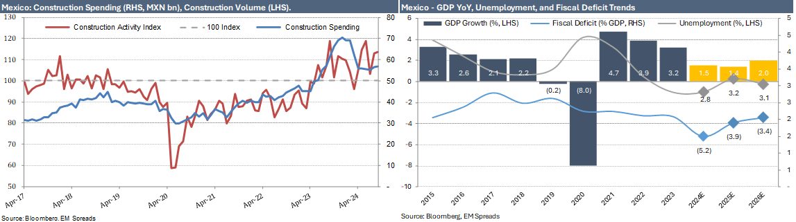 Mexican construction fundamentals remained relatively healthy in 3Q24 compared to historical figures, though they were significantly pressured relative to 3Q23. Mexican construction spending declined by 0.9%, 7.5%, and 13.1% in July, August, and September, respectively. In September 2024, the Mexican construction business confidence index fell below 50, indicating contraction territory at 48. However, the Mexican construction activity index remained robust, at 113 and 114 in July and August. Regarding macroeconomic indicators, Mexico’s GDP per capita is projected to grow modestly by 1.5% in 2024, 1.4% in 2025, and 2.0% in 2026. The fiscal deficit is expected to be significant at -5.2% in 2024, improving to -3.9% in 2025 and -3.4% in 2026.