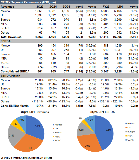 Mexico 3Q24 revenue decreased 16.5% (l-t-l: -5%) YoY to $1.1 billion, and EBITDA fell 19.9% (l-t-l: -8%) to $319 million. Operations in Mexico were affected by lower volumes and reduced prices in US Dollars. Volumes were negatively impacted by reduced construction activity following the June election and adverse weather, with precipitation levels 50% higher YoY.
