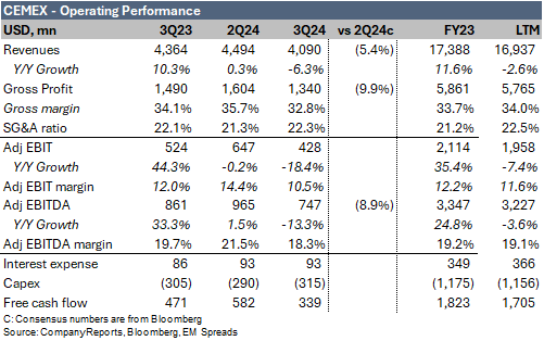 Cemex 3Q24 results were weaker than expected. Cemex reported a 6.3% decline in 3Q24 revenues to $4.1 billion (l-t-l: -3%), missing consensus expectations by 5.4%. This shortfall was primarily due to weaker volumes in Mexico and the US and the impact of MXN depreciation. Adjusted EBITDA decreased by 13.2% YoY (l-t-l: -9%) to $746.7 million from $861.1 million in 3Q23, coming in 8.9% below consensus expectations.