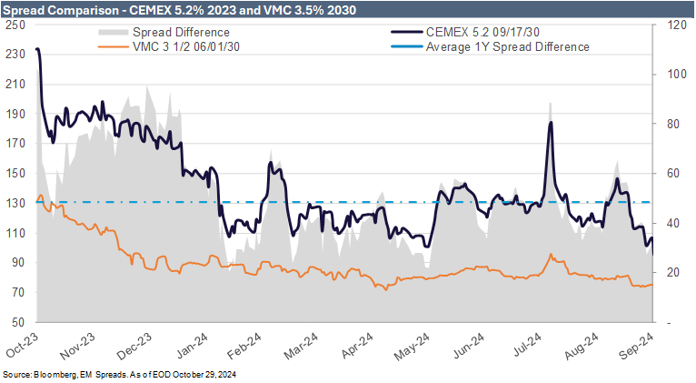 Given Cemex’s significant and growing exposure to the US and Europe, we find it beneficial to analyze Cemex’s bonds in comparison to the US market and US peers. Compared to the broader US market and peers within the cement industry, Cemex’s bonds no longer appear compelling at currently tight spread levels. The spread difference between CEMEX 2030 notes trading at 85 bps and VMC 3.5% 2030 notes at 69 bps is around 16 bps—significantly below the 1-year average of 48 bps. The spread difference reached 89 bps in early August, meaningfully higher than current levels. We believe Cemex’s risk/reward profile is skewed to the downside. Still, those investors comfortable wading through near-term volatility should be rewarded by a wider spread relationship at some point over the next 12 months closer to around 50 bps, which we consider fair value.