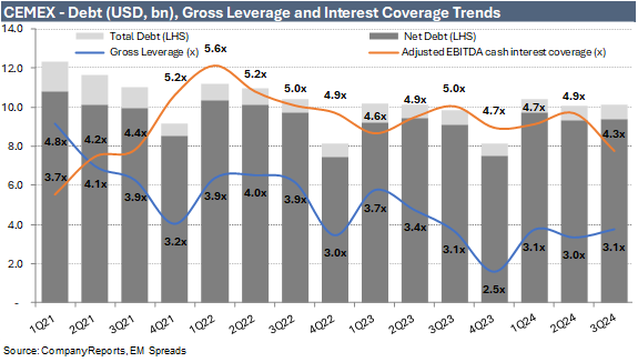 Cemex ended the quarter with $10.1 billion of total debt, up $60.8 million sequentially. Net debt increased $68.3 million QoQ to $9.4 billion. Gross and net leverage increased by one tick sequentially to 3.1x and 2.9x, respectively. FFO to debt decreased to 16.0% as of September 2024, down from 19.4% as of June 2024, and EBITDA cash interest coverage deteriorated to 4.3x from 4.9x sequentially.