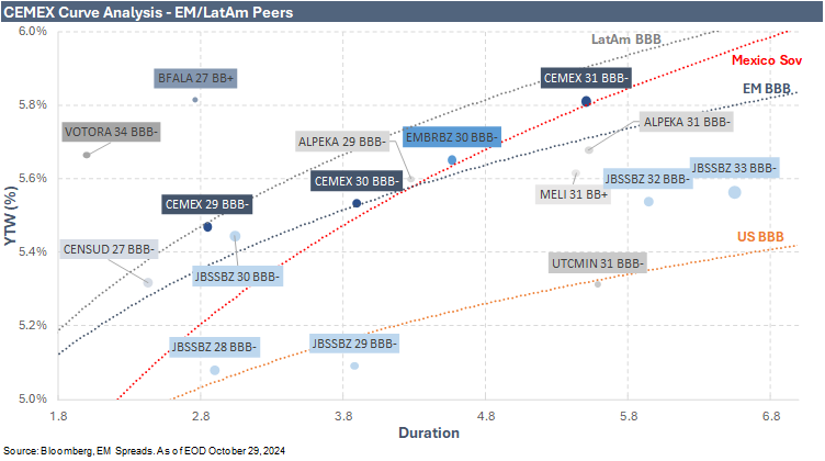 The recent weak 3Q24 results, which damped operational momentum to catalyze what we view as Cemex moves toward becoming a mid-BBB credit, support this view. Additionally, we see current headline risk as elevated, as the market increasingly anticipates a second Trump presidency, which we expect to be at least initially perceived negatively for US-Mexico relations. Consequently, we find CEMEX bonds uncomfortably tight relative to US peers at current spread levels.