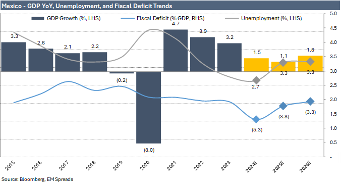 Unemployment is expected to rise modestly from 2.8% in 2024 to 3.3% in 2025 before slightly declining to 3.2% in 2026. Meanwhile, the fiscal deficit is projected to remain substantial at -5.4% of GDP in 2024 but improve to -3.8% in 2025 and -3.4% in 2026.