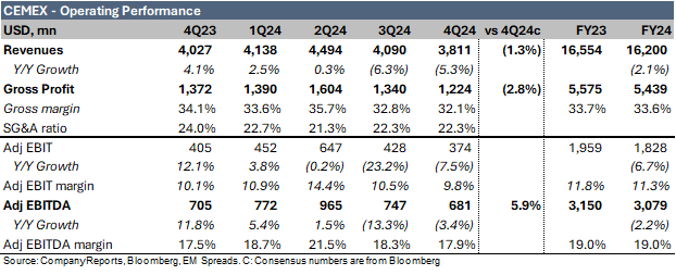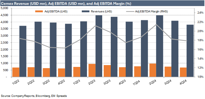 Solid 4Q24 EBITDA and Cash Generation. Cemex reported a 5.3% decline in 4Q24 revenue to $3.8 billion (l-t-l: 0%), missing consensus expectations by 1.3%. The shortfall was primarily due to weaker volumes in Mexico and the U.S., along with the impact of MXN depreciation on pricing. Adjusted EBITDA declined 3.4% YoY (l-t-l: +3%) to $681 million from $705 million in 4Q23 but exceeded consensus by 5.9%. The EBITDA margin expanded 36 bps to 17.9%.