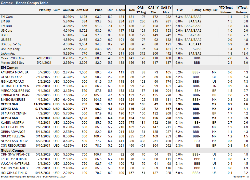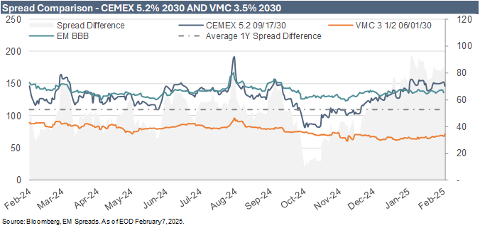 Absent the current uncertainty surrounding potential U.S. tariffs, we would view these spread levels as attractive for U.S. investors. However, given the broader risks posed by a potentially disruptive trade environment, we believe Cemex’s risk/reward profile is skewed to the downside. As a result, we do not see an attractive entry point for CEMEX bonds at this time. That said, we would keep the name on our watchlist for potential investment should U.S.-Mexico relations improve, and the risk of tariffs subside.