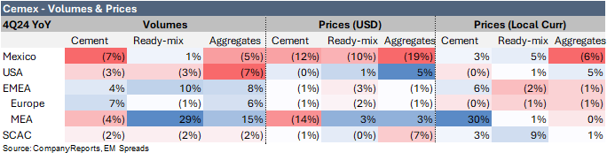 4Q24 EMEA revenue increased 5.3% YoY (l-t-l: +8%) to $1.2 billion, driven by a 13.7% YoY rise in MEA to $282 million and a 2.8% improvement in Europe to $872 million. The revenue growth was primarily supported by higher volumes in Cement (+4% YoY), Ready-mix (+10%), and Aggregates (+8%), partially offset by lower US Dollar prices in Cement (-1%), Ready-mix (-3%), and Aggregates (-1%). In Europe, volume growth was broad-based, with Eastern Europe serving as the primary driver due to EU-funded infrastructure spending, while Western Europe showed early signs of recovery.