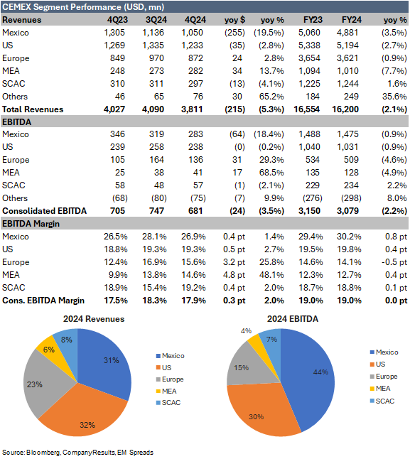 Mexico: Weaker Volumes and FX Headwinds. 4Q24 revenue declined 19.5% YoY (l-t-l: -6%) to $1.1 billion, while EBITDA fell 18.4% (l-t-l: -4%) to $283 million. Despite a 38 bps EBITDA margin expansion to 26.9%, supported by favorable price/cost dynamics, operations were impacted by weaker volumes and lower US Dollar prices, partially offset by higher local currency prices.