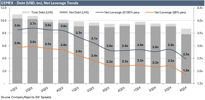 Lower Debt and Leverage Improvement. Cemex ended 4Q24 with $8.7 billion in total debt, including perpetual bonds, down $812 million sequentially. Net debt declined significantly by $1.25 billion to $7.8 billion. Gross leverage, including perpetual bonds, improved by 0.2x to 2.7x as of December 2024, while net leverage fell 0.4x to 2.5x.