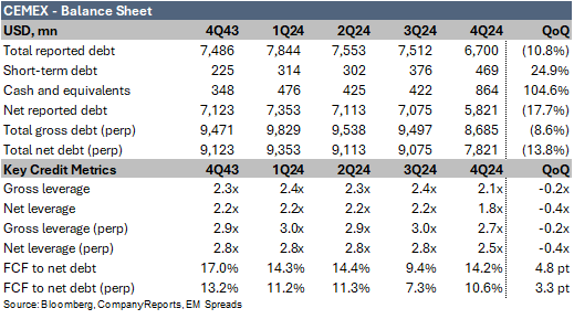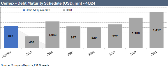That said, Cemex has maintained a disciplined financial strategy, steadily improving its credit metrics while remaining committed to its 1.5x leverage target over the next two years. Strong cash generation, financial flexibility, and ample liquidity support this approach. Liquidity should further improve in 1Q25 following the $950 million proceeds from the Dominican Republic asset divestment. We expect Cemex to maintain this trajectory and believe it could evolve into a mid-BBB credit over the medium term. The company will likely continue strengthening its balance sheet and credit profile, backed by solid cash generation and improving market conditions in key regions. Additionally, management announced a cost-cutting program that could generate approximately $150 million in EBITDA savings in 2025