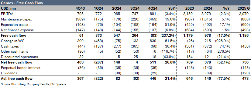 4Q24 EBITDA of $681 million did not fully cover $463 million in maintenance capex, $164 million in expansion capex, and $137 million in net finance expenses, resulting in a free cash outflow of $83 million. After accounting for a $630 million working capital inflow, $60 million in taxes, $6 million in other cash items, and $18 million from discontinued operations, net free cash flow totaled $511 million in the quarter. This represents an improvement from 4Q23, when Cemex generated $403 million in net free cash flow, primarily due to a working capital release.