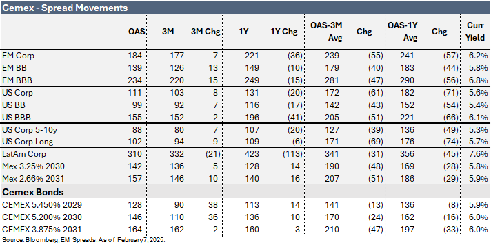 We maintain our Market Perform recommendation on Cemex. We continue to view Cemex as an attractive emerging market credit story, supported by credit-positive strategic priorities, a commitment to strengthening its credit profile, and healthy cash generation capacity. However, current spread levels appear fair and do not offer an attractive entry point, particularly given the potential risk of U.S. tariffs on Mexican imports, which could significantly impact the broader Mexican economy. That said, spreads may be more appealing to investors who see tariff concerns as overstated or unlikely to materialize. We would keep the name on our watchlist for potential investment should this risk of U.S. tariffs subside.