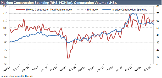 Fundamentals in Mexico remained relatively healthy in October and November compared to historical figures, though they weakened significantly relative to the same period in 2023. Mexican construction spending declined 19.5% YoY in October, 18.7% in November, and 21.5% in December. On a month-over-month basis, the construction spending index fell 3.6% in October, rebounded 3.0% in November, and then declined 5.4% in December.