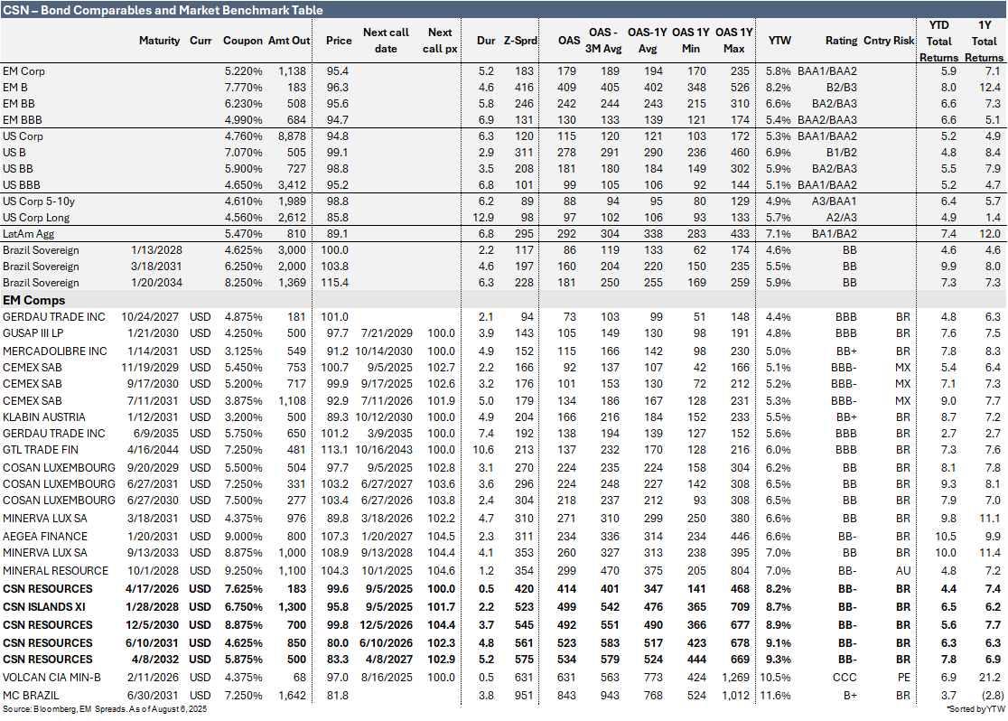 We maintain our Overweight recommendation, favoring the CSNBZ 4.625% 2031s (yielding 9.1%, priced at $80.0) and CSNBZ 5.875% 2032s (yielding 9.3%, priced at $83.3) for their attractive carry, potential price upside, and wide spreads versus the LatAm BB curve. We believe CSN’s credit metrics will remain broadly stable, while spread compression could be supported by Brazilian protectionist measures on steel imports, a possible recovery in steel prices from Chinese production cuts, asset sales, anticipated domestic rate cuts, and improving global trade sentiment.