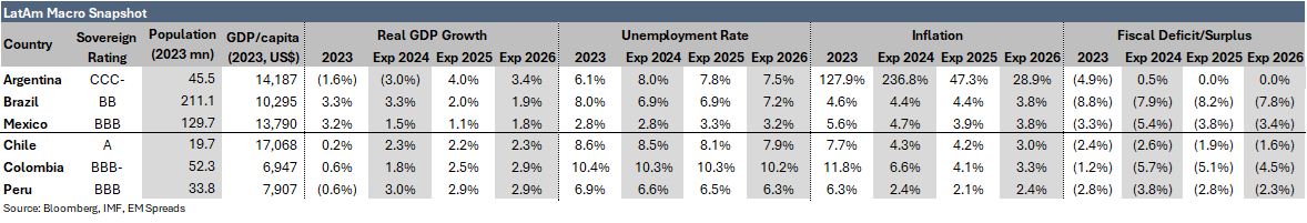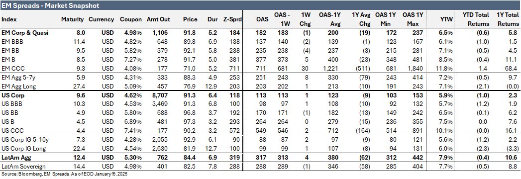 The LatAm Corporate Index widened by 4 bps to 317 bps in the week ended Wednesday, January 15, 2025, while the broader EM Index narrowed by 1 bps to 182 bps, and the broader US Index widened by 1 bps to 113 bps over the same period. The region’s equity markets had a mixed performance: Argentina’s Merval Index (in USD) declined by 2.8%, Brazil's Ibovespa Index rose by 2.5%, Mexico’s Mexbol Index increased by 1.2%, and the S&P 500 Index gained 0.5%. WTI and Brent crude are trading at US$80.5/bbl (+8.3%) and US$82.5/bbl (+6.8%), respectively. Meanwhile, yields on U.S. Treasuries climbed, with the 10Y yield up 4 bps to 4.65% and the 5Y yield up 1 bps to 4.45%.