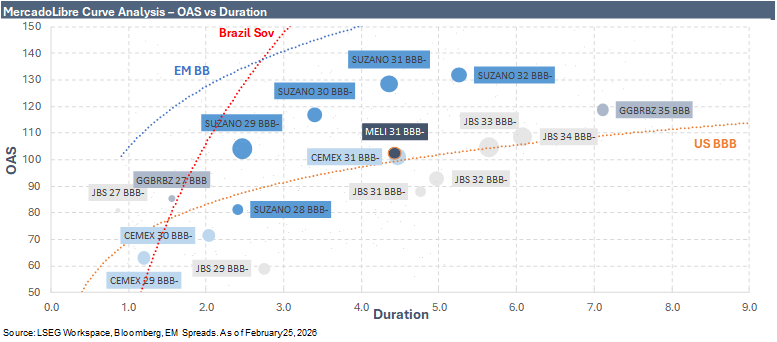 From a relative value perspective, MELI (BBB-) 3.125% 2031 notes trade at approximately 102 bps OAS with 4.4 years of duration and a 4.6% YTW. The bonds are currently priced at $93.4, below par, which provides visible pull-to-par support over time if spreads remain stable. That said, the discount price largely reflects the lower coupon structure rather than an outright spread concession, and convexity benefits are moderate given the intermediate duration profile. At current levels, we think meaningful price upside would primarily require further spread compression.