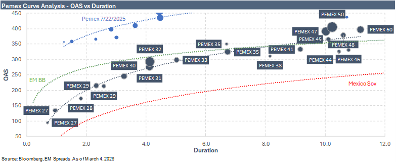 Looking ahead, the 2026 credit story appears more dependent on technical and policy factors than on a meaningful improvement in underlying operating fundamentals. The large-scale support measures implemented during 2025 materially reduced near-term refinancing risk, but the scope for additional extraordinary interventions appears more limited in the near term. As a result, we believe the next phase of performance will likely depend more heavily on the pace of sovereign support through the federal budget, the evolution of Pemex’s funding strategy, and broader EM credit market conditions.