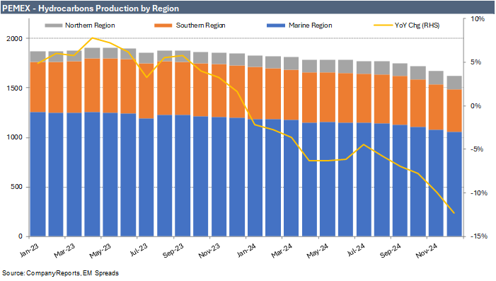 Since before Claudia Sheinbaum’s election, both the previous and current administrations have emphasized that government financial support for Pemex is in the country’s best interest, positioning the company as a strategic asset for Mexico’s economy. The new administration has continued efforts to reclassify Pemex as a public entity rather than a productive enterprise, incorporating it into the 2025 government budget with a promised ~US$6.7 billion in support. Additionally, the administration has made some positive statements in recent weeks, including assurances that Pemex will not tap the debt market in 2025. President Sheinbaum also announced in a press briefing that Pemex's outstanding payments to suppliers are expected to be settled by March 2025, while the administration has signaled openness to joint ventures in the exploration and production sector. On January 29, 2025, Sheinbaum further proposed an energy reform aimed at reinforcing state control over the sector.