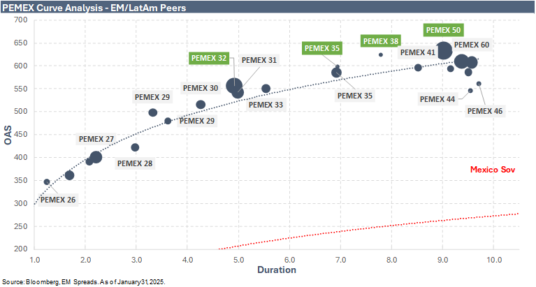 Within Pemex’s capital structure, we continue to prefer the PEMEX (B3/BBB/B+) 5.950% 2031, yielding 9.0% for a 5.0-year duration; the PEMEX 6.625% 2035, yielding 9.8% for a 6.9-year duration; the PEMEX 6.625% 2038, yielding 10.1% for a 7.8-year duration; and the PEMEX 7.690% 2050, yielding 10.4% for a 9.0-year duration. These bonds offer an attractive yield pickup relative to sovereign bonds and are currently trading wider than the overall Pemex curve. The spread pickup to the sovereign is more favorable at the belly and long end of the curve than in shorter-dated notes. Furthermore, most Pemex bonds maturing before 2029 trade at or near par, reducing their upside potential, while the 2031s, 2038s, and 2050s trade well below par at $84.0, $72.7, and $74.6, respectively.
