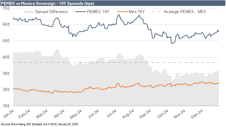 At around 319 bps, the current spread difference between PEMEX 10Y and Mexican Sovereign 10Y is 48 bps below the one-year average of 367 bps, though still wider than the one-year low of 258 bps reached on November 8, 2024. Year-to-date, the PEMEX 10Y–Mexico 10Y spread difference has ranged between 278 bps and 326 bps, placing current spreads near the wider end of this range. Over the past twelve months, the spread difference has ranged between 258 bps and 450 bps, currently sitting closer to the tighter end of this range. However, spreads remain 31 bps tighter than when we initiated coverage with an Outperform recommendation on September 29, 2024. For context, in early 2019, when Pemex still held an investment-grade credit rating, the average spread difference between the company and the sovereign was 243 bps, significantly tighter than current levels. However, Pemex’s overall credit profile was also stronger at that time, with significantly better credit metrics.