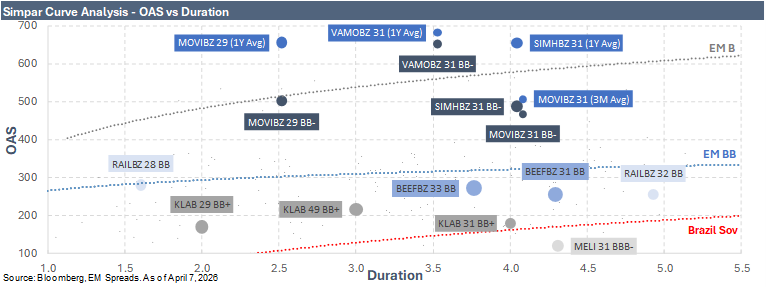 We maintain our preference for the VAMOBZ 9.200% 2031 notes as the primary expression of a constructive view on the credit. Since January 6, SIMHBZ 2031 has compressed by roughly 148 bps to 498 bps, while VAMOBZ 2031 has drifted modestly wider to 649 bps, creating a 151 bps spread gap versus the essentially flat relationship that existed at initiation and a 160 bps yield gap in VAMOBZ’s favor. VAMOBZ also retains a shorter duration at 3.5 years versus 4.0 years for SIMHBZ. In our view, this combination of higher carry, lower duration, and operating-company positioning continues to make VAMOBZ the most attractive way to express the improving Simpar credit story for investors focused on defensive carry and downside protection. MOVIBZ 2029 remains the middle ground for investors focused on shorter duration and liquidity.