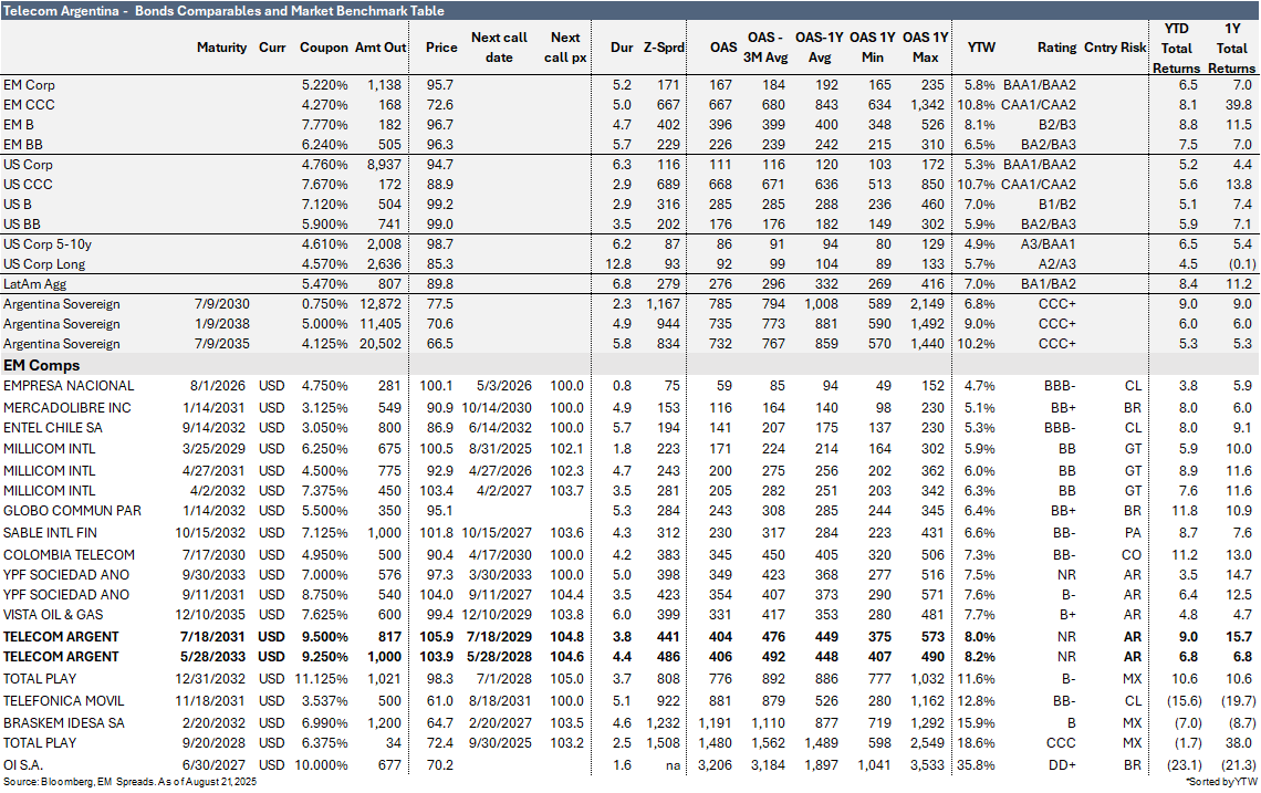 We maintain our Neutral recommendation on Telecom Argentina (B2/B-/B). The notes offer attractive yields, and we think Telecom’s strategy is well positioned to leverage its strong market presence, with leverage metrics appearing solid and expected to improve further as the Telefónica integration progresses. However, we think a better entry point may emerge once there is greater clarity on regulatory, acquisition, and political fronts, while the 2031 and 2033 notes trade above par at $105.9 and $104.6, respectively, limiting near-term upside.