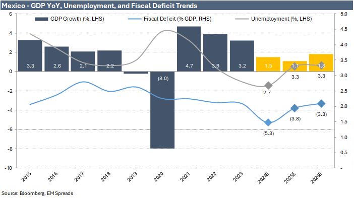 Additionally, Pemex’s credit story remains highly dependent on financial support from the Mexican government, given its unsustainable standalone credit profile, which is characterized by a significant debt burden, weak liquidity, high debt service costs, and persistent negative cash flows. Potential tariffs would likely put further pressure on the overall Mexican economy, which serves as the implicit guarantee for Pemex’s debt, reducing the government’s ability to provide support. Mexico is already projected to run a 3.8% fiscal deficit in 2025 without accounting for tariffs, which would likely widen if tariffs were implemented. This could lead to significantly lower confidence in the government’s capacity to back Pemex’s debt, further weakening the company’s credit profile.