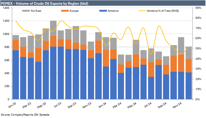 Consequently, potential U.S. tariffs on Mexico could significantly negatively impact Pemex. Even though the company has some capacity to redirect exports to Europe and other regions, this could lead to additional logistical costs and lower realized prices, further affecting operational performance.