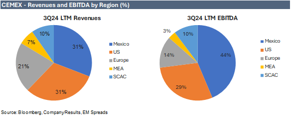 Cemex has been advancing its growth-oriented portfolio optimization by executing strategic divestments, particularly in selected Emerging Markets, to streamline its holdings and drive further investment in the U.S., Mexico, and Europe, primarily through bolt-on opportunities. Consequently, we expect Cemex’s exposure to the U.S. to continue increasing in 2025, given the company’s strategy and the divestment of its Dominican Republic operations, which represented 2.1% of 2023 revenues and 4.2% of EBITDA. In the last twelve months ending in September 2024, the company generated approximately 31% of its revenues in Mexico and 31% in the U.S., while 44% of its EBITDA came from Mexico and 29% from the U.S.