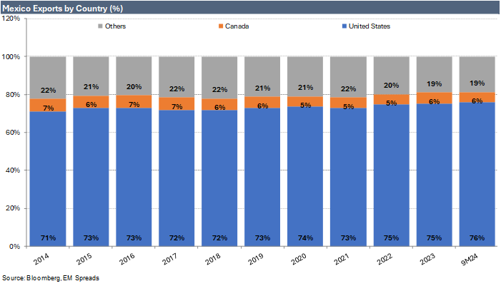 Mexico's economy is highly exposed to U.S. tariffs due to its deep trade integration with the United States, underpinned by the United States-Mexico-Canada Agreement (USMCA). In 2023, 75.3% of Mexico’s exports went to the U.S., rising to 75.8% in the first nine months of 2024. This makes it the most dependent economy in Latin America on American demand. This heavy reliance spans key industries such as automotive manufacturing, electronics, and agriculture, where supply chains are tightly linked across the border.