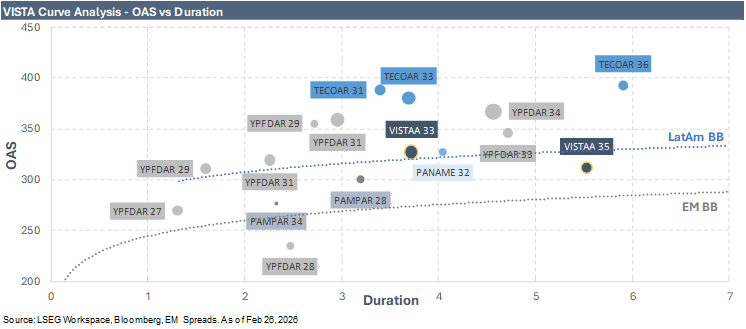 From a curve positioning standpoint, the VISTAA 8.500% 2033 notes trade at an OAS of 327 bps, with a 3.7-year duration and a yield to worst of 7.0%, while the VISTAA 7.625% 2035 notes trade at 312 bps OAS, with a 5.5-year duration and a yield to worst of 7.2%. In our view, the modest yield pickup on the 2035s does not adequately compensate for nearly two additional years of duration and higher exposure to Argentina risk. The 2033s offer a more balanced combination of carry and lower volatility, in what we view as the most efficient part of the curve for investors seeking exposure to Argentina’s shale growth story without assuming incremental duration risk.
