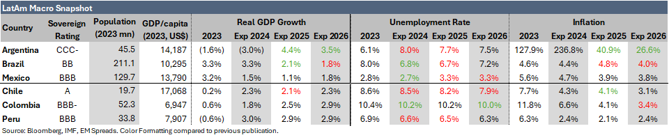 Turning to bond yields, U.S. Treasuries saw decreases, with the 10-year yield down 11 bps to 4.51% and the 5-year yield also down 11 bps to 4.31%. In contrast, the yield on the 10-year Mexican government bond fell by 1 bps to 6.47%, the 10-year Brazilian government bond remained stable at 6.80%, and the 10-year Argentine government bond declined by 21 bps to 10.14% over the week.
