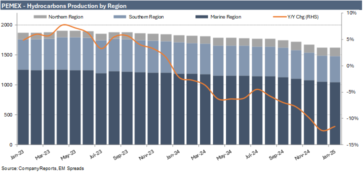 EM Spreads Comment: Sheinbaum’s restructuring plan underscores the administration’s intent to consolidate control over the energy sector and reinforce Pemex’s role as a vertically integrated state operator. We think the elimination of subsidiaries could support tighter budgetary oversight and reduce redundancies, but the impact on efficiency and transparency remains uncertain. The MXN120 billion (~$6.4 billion) supplier payment program provides near-term liquidity relief, and recent operational gains in refining yields and upstream discoveries offer incremental support. Still, Pemex’s elevated leverage, continued E&P underperformance, and exposure to refining losses remain key concerns. While we view the administration’s openness to selective private investment, such as potential involvement in Lakach, as a constructive signal, the success of this policy reset will ultimately hinge on improved governance, execution, and financial discipline. We continue to monitor supplier payments, oil output trends, and board-level reform implementation.