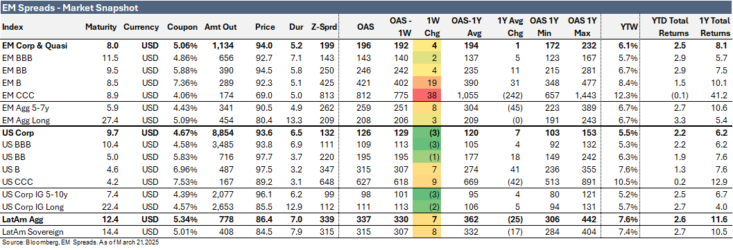 The LatAm Aggregate Index expanded by 7 bps to 337 bps in the week ending Friday, March 21, 2025. Meanwhile, the broader Emerging Market Index widened by 4 bps to 196 bps, while the broader U.S. Index also increased by 8 bps to 126 bps. Notably, the EM CCC Index widened significantly by 38 bps to 812 bps.