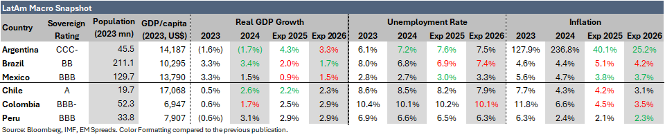 Turning to bond yields, U.S. Treasuries saw modest declines. The 10-year yield fell 7 bps to 4.25%, while the 5-year yield declined also by 7 bps to 4.00%. In Latin America, the yield on the 10-year Mexican government bond dropped 6 bps to 6.25%, the 10-year Brazilian government bond fell 7 bps to 6.52%, while the 10-year Argentine government bond increased 21 bps to 11.09% over the week.