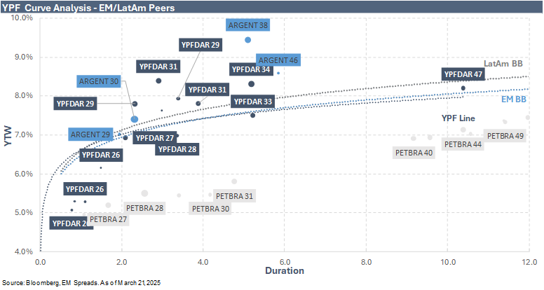 From a credit perspective. YPF’s results showed weakening fundamentals, with LTM EBITDA down 5.0% and total debt rising 4.6%, and a significant drop in LTM funds from operations. Gross leverage increased 0.2x QoQ to 2.1x as of December 2024, while net leverage worsened 0.1x to 1.8x, and cash interest coverage declined 0.2x to 4.2x. However, liquidity improved after the $1.1 billion issuance, which facilitated the repayment of YPF’s 2025 bonds, effectively reducing short-term debt and increasing cash on hand.