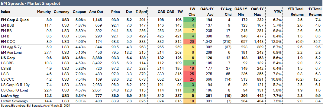 The LatAm Aggregate Index widened by 5 bps to 342 bps in the week ending Friday, March 28, 2025. The broader Emerging Market Index increased by 2 bps to 198 bps, while the U.S. Aggregate Index also widened by 6 bps to 132 bps. Notably, the US B and US CCC Indices posted the largest increases, rising by 25 bps to 339 bps and 652 bps, respectively. The EM CCC Index also widened, increasing by 20 bps to 805 bps.