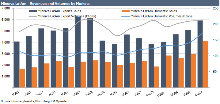 EM Spreads Comment: We think Minerva remains the cleanest way to play the Chinese beef import story in Latin America. Its cross-border slaughtering and export-oriented model allow it to arbitrage cattle availability and price differences across Brazil, Argentina, Uruguay, Paraguay, and Colombia. China remains one of its largest destination, accounting for 12% of 4Q24 beef exports. With the pending acquisition of Marfrig’s assets expected to consolidate Minerva’s leadership in the region, we believe stronger Chinese demand and a tighter U.S. supply outlook could support earnings momentum in 2025.