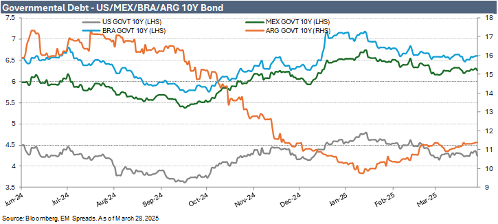 Turning to bond yields, U.S. Treasuries saw mixed performances. The 10-year yield remained stable at 4.25%, while the 5-year yield declined by 2 bps to 3.98%. In Latin America, the yield on the 10-year Mexican government bond increased 2 bps to 6.27%, the 10-year Brazilian government bond rise 4 bps to 6.56%, while the 10-year Argentine government bond increased 10 bps to 11.41% over the week.