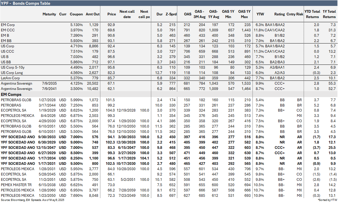 We maintain our Outperform recommendation on YPF (Caa1/B-/CCC), with a preference for the YPFDAR (Caa1/B-/CCC) 8.500% 2029s, YPFDAR 9.000% 2029s, YPFDAR 9.500% 2031s, and YPFDAR 8.250% 2034s.