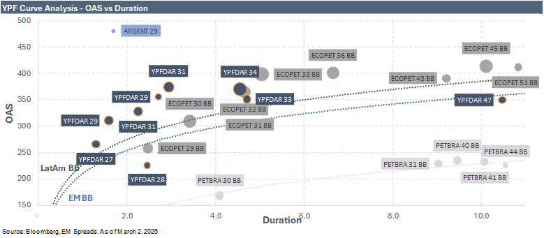 We think 4Q25 reinforces the structural improvement in the operating profile. The transition toward a lower cost, more oil weighted portfolio continued to gain traction, with shale oil production up 41.9% YoY, representing 71.5% of total crude, and total lifting costs down 44.2% YoY. This mix shift, together with the sharp recovery in downstream profitability, helped lift adjusted EBITDA 53.0% YoY. The accelerated exit from mature conventional fields, combined with Vaca Muerta scale and midstream and export projects, including VMOS, with first oil expected in December 2026 at ~180 kbbl/d and ramping to ~550 kbbl/d by 3Q27, and Argentina LNG, with FID targeted for 2026, continues to de risk the asset base and improve through cycle margin resilience. This supports a more durable hard currency cash generation profile as export capacity expands and strengthens the standalone credit profile.